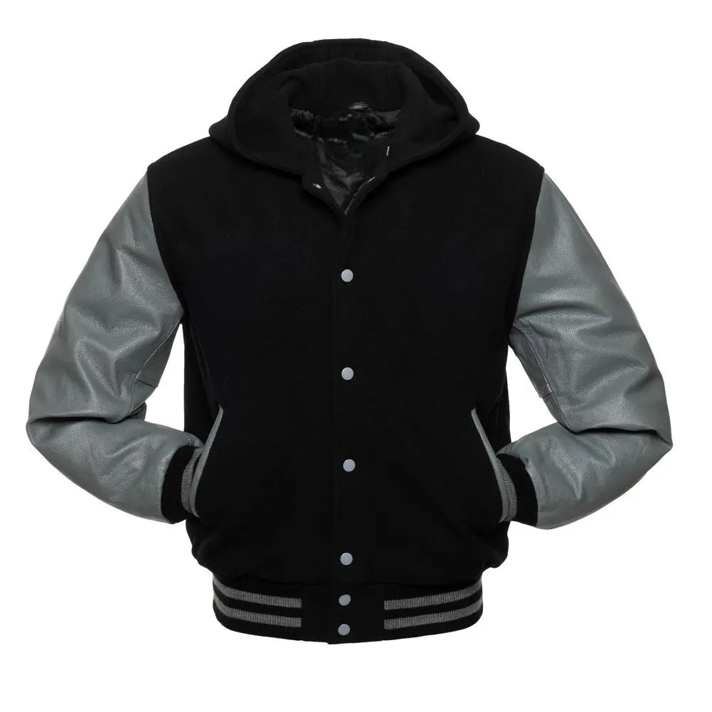 Mens Hooded Leather Sleeves Varsity Jacket