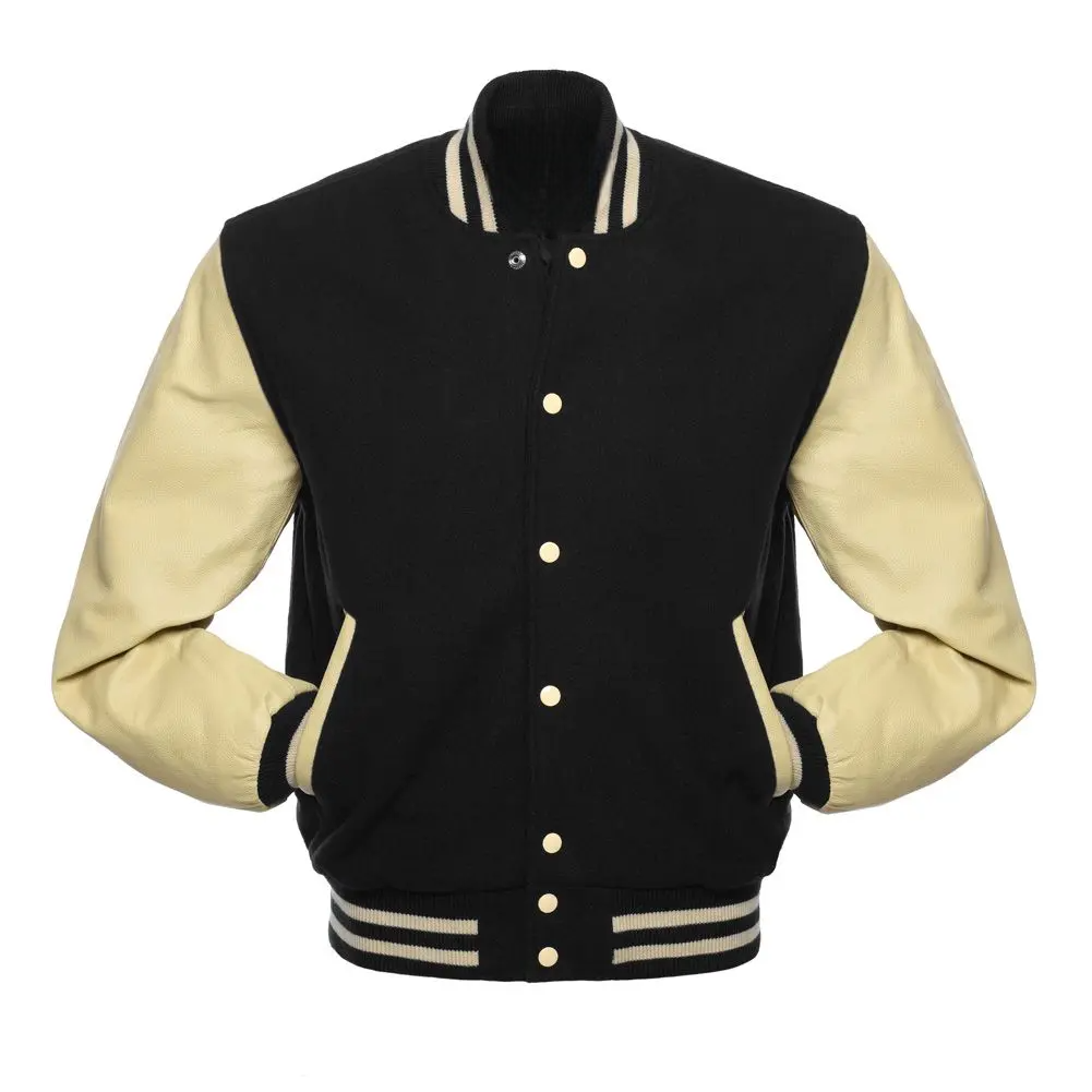 Black Wool Cream Leather Sleeves Varsity Jacket