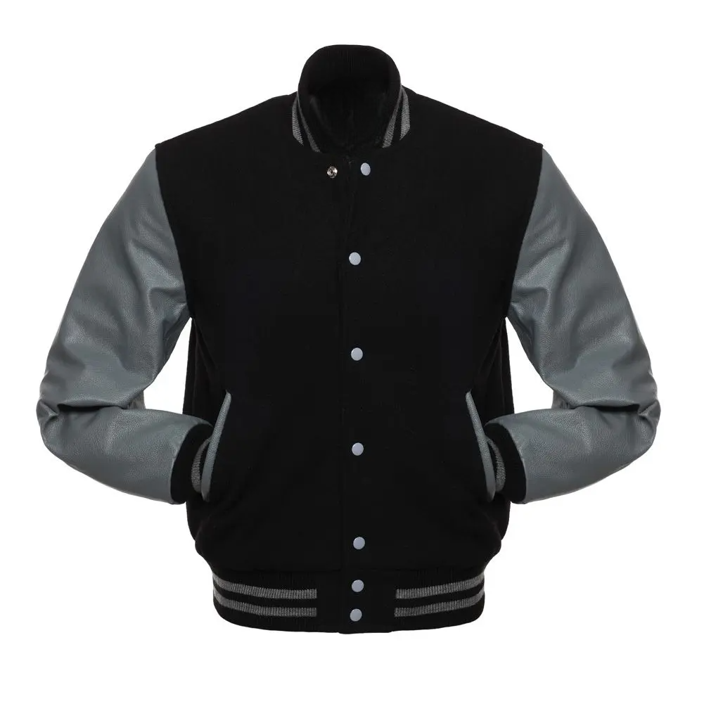 Unisex Black Wool Grey Leather Varsity Jacket