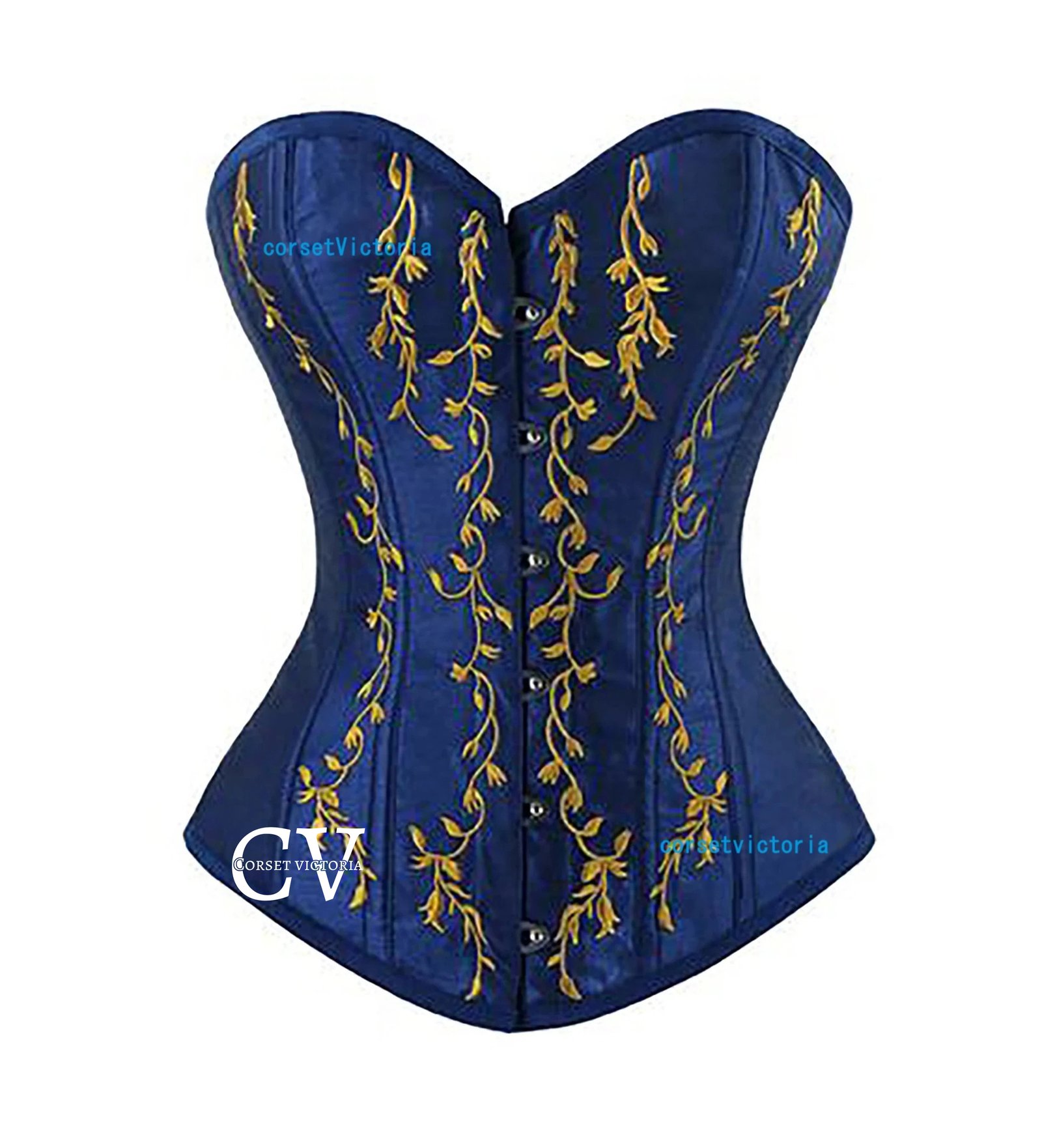 Blue Satin Underbust Corset Gold Embroidered Gothic Costume