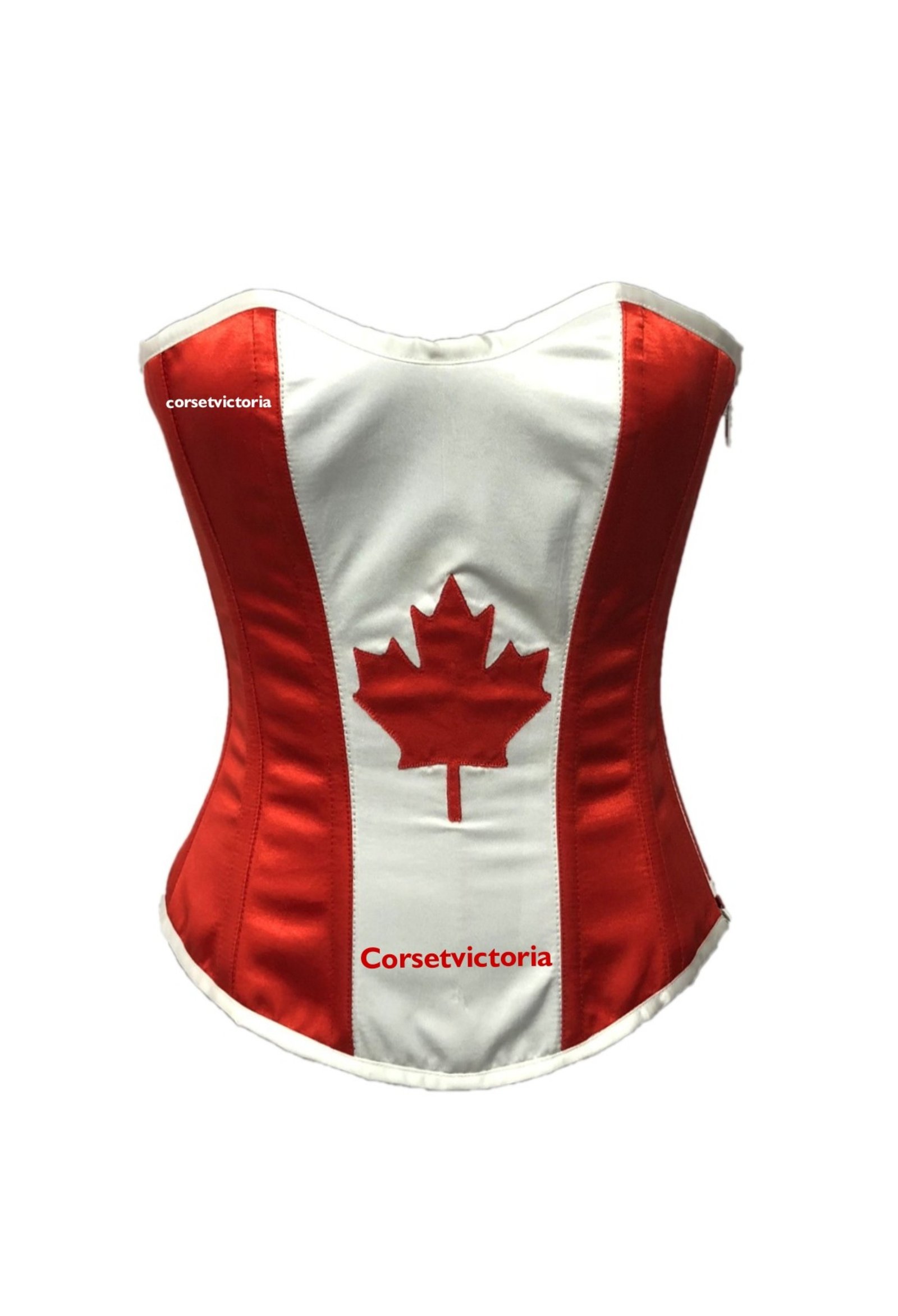 Corsetvictoria Maple leaf Red And White Satin Overbust Corset Costume Canada Flag Bustier Top