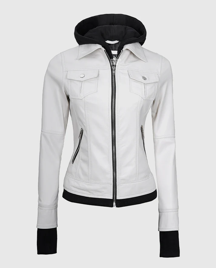 Women’s Hood Removable White Leather Jacket
