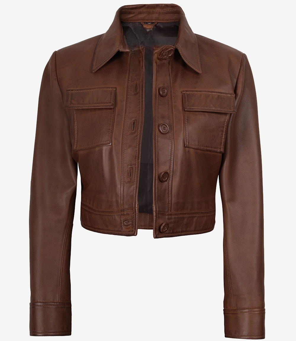 Womens Real leather Cropped Brown Trucker Jacket