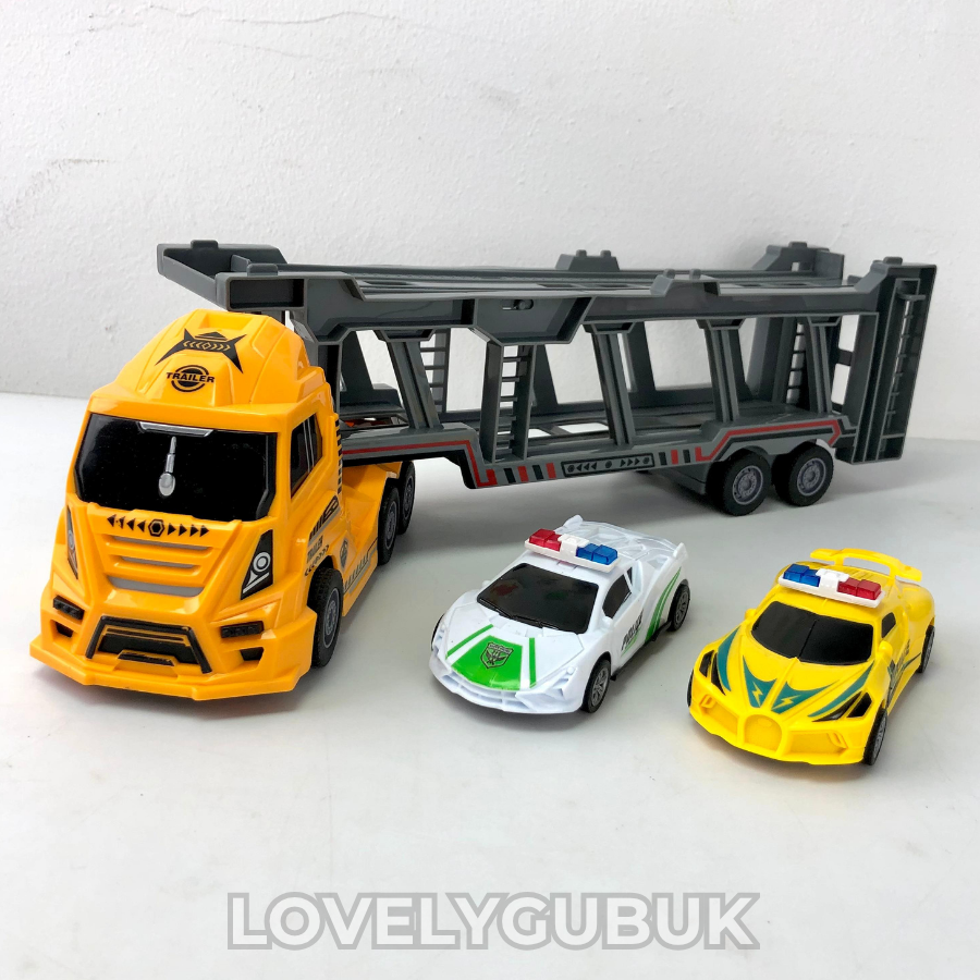 Mainan Mobil Truk Kontainer Carrier Besar 2 Tingkat City Transportation dan 4 Mobil Polisi Diecast